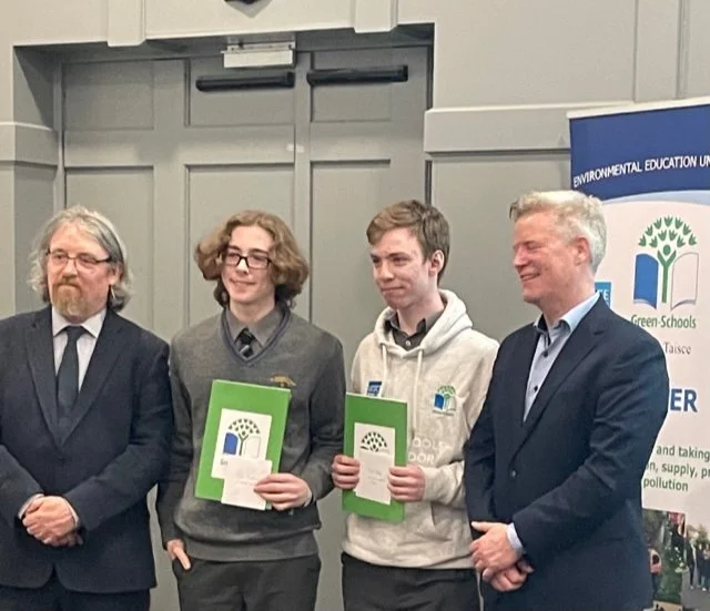 Felix O'Sillivan and Niall Kelly with Michael John O'Mahony Director of Environmental Education Unit, An Taisce and Geoffrey Bourke of Irish Water, at the Green Schools Water Awards. Felix, Niall and Sam Cooke are the Southern Runner Up Winners of the Water Ambassador Programme.