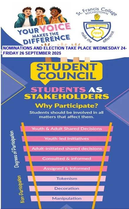 Student leaders have an increased sense of responsibility to help others and to model leadership principles and values. When students experience a sense of belonging and significance through voice, agency and leadership, they are likely to articulate their sense of empowerment and school pride. Click here for a link to the St Francis College Student Council Leadership Badges Ceremony, 2025.